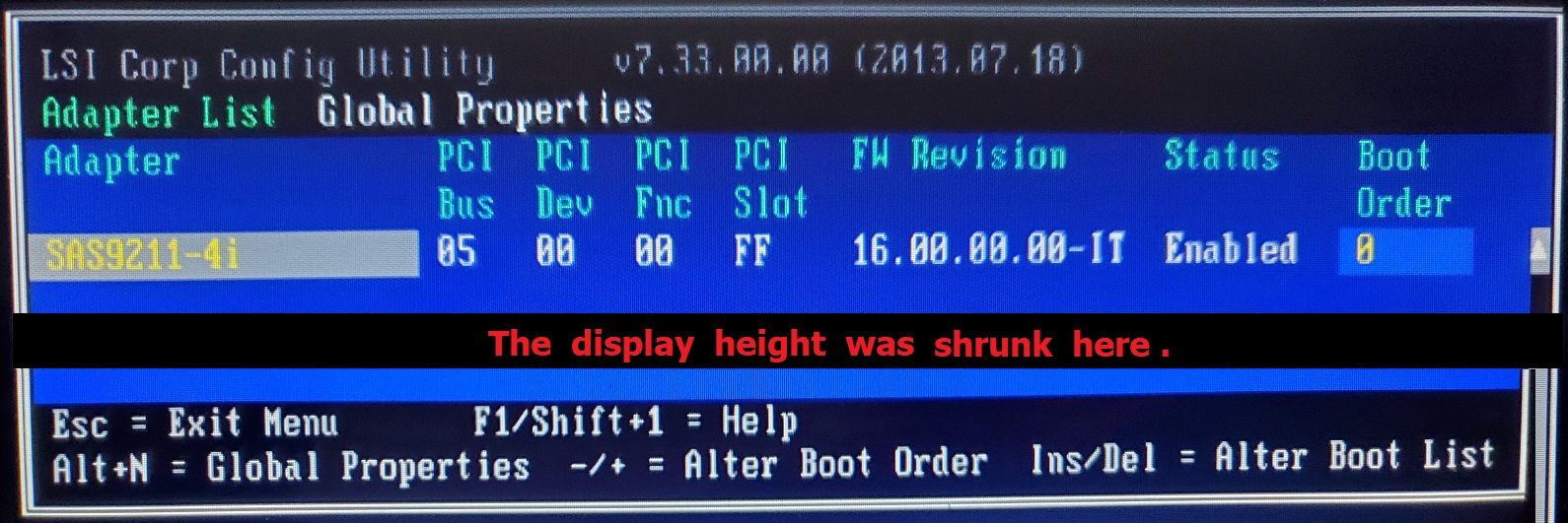 LSI Hardware BIOSEvery time the device is powered on, the first thing displayed on the screen is a notice for accessing the LSI Configuration Utility; an occasion which would be very rarely necessary. If you use a Keyboard to do so, youll find that the SAS Controller card installed is an SAS9211-4i (which supports the 4 SAS/SATA connectors installed in the device):