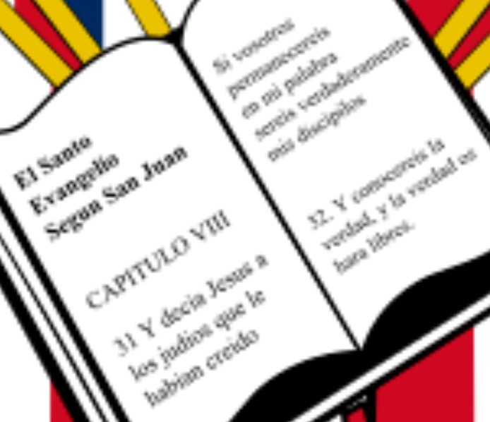 or in English: In the center it has the Bible open to the Gospel of Saint John, chapter 8, verse 32), the full contextual reference (including all of verse 31) appears on